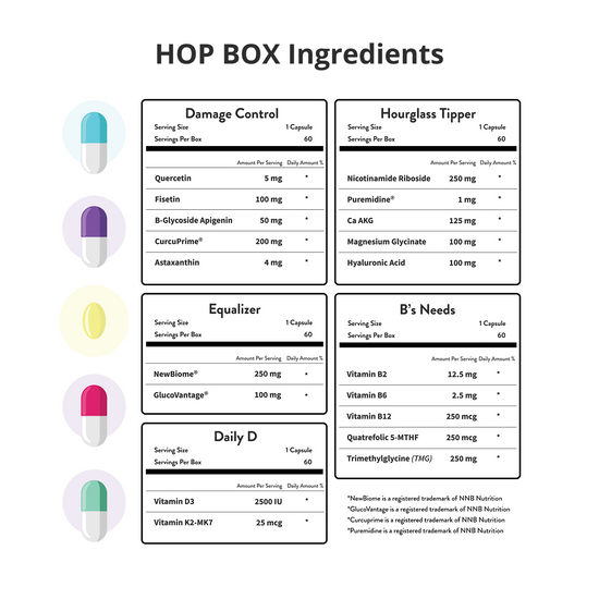 HOP Box is the only doctor-formulated women's supplement box created to support longevity at the cellular level.